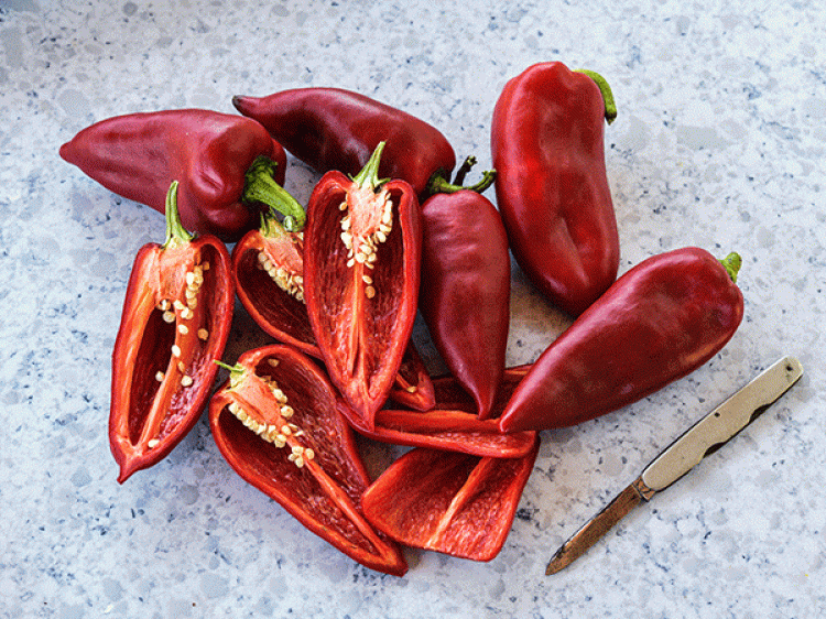| Here’s a really outstanding roasting pepper from North Macedonia. Two-foot, stocky plants are covered in 6- to 7-inch, broadly wedge-shaped pods that ripen green to deep, rich red. These peppers are incredibly fragrant and tasty. | |