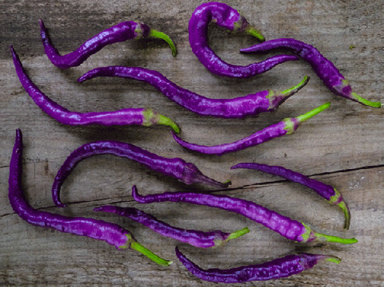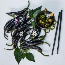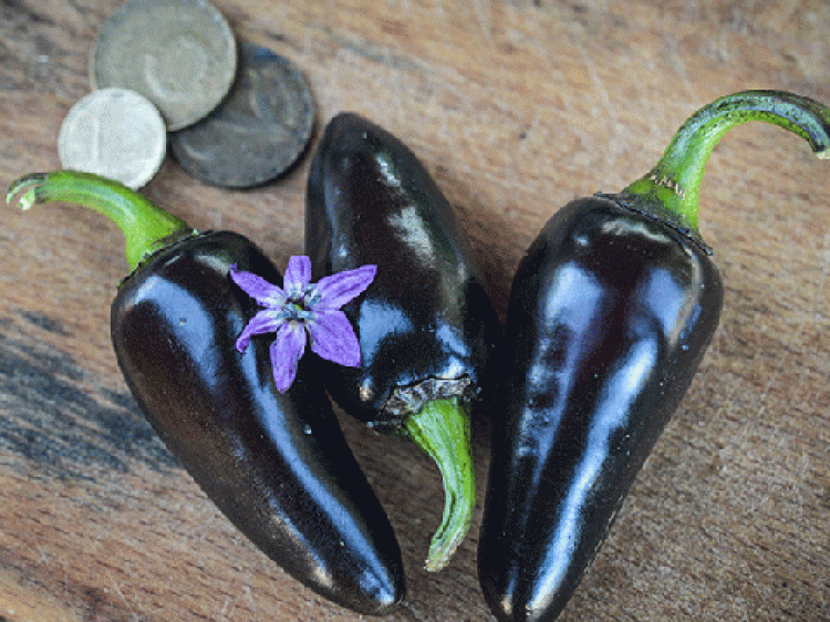 | Unique, black-colored fruit that is the shape of a jalapeño. It is mildly hot and has a delicious flavor. Plants have beautiful purple flowers that make this variety very ornamental. Rare and colorful! | |