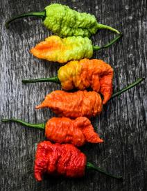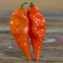 | A gorgeous and intense pepper with a twisted shape that ranks among the world’s hottest! We were introduced to this little scorcher by extreme pepper expert, Jim Duffy of Refining Fire Chiles. The menacing fruit is contorted and wrinkled with a fierce little scythe-shaped tail. Jim reports that this pepper has a floral flavor and intense mouth burn that hits the tongue, gums, and roof of the mouth. | |