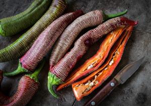 | The name means “engraved.” Another local name, Vezeni Piperki, means “embroidered.” Both names refer to the curious lines on the skins of the tapering, long, thin peppers. The fruit, which ranges from mild to sometimes very pungent, is to be seen hanging in great clusters, drying in North Macedonian warm late autumn sun | |